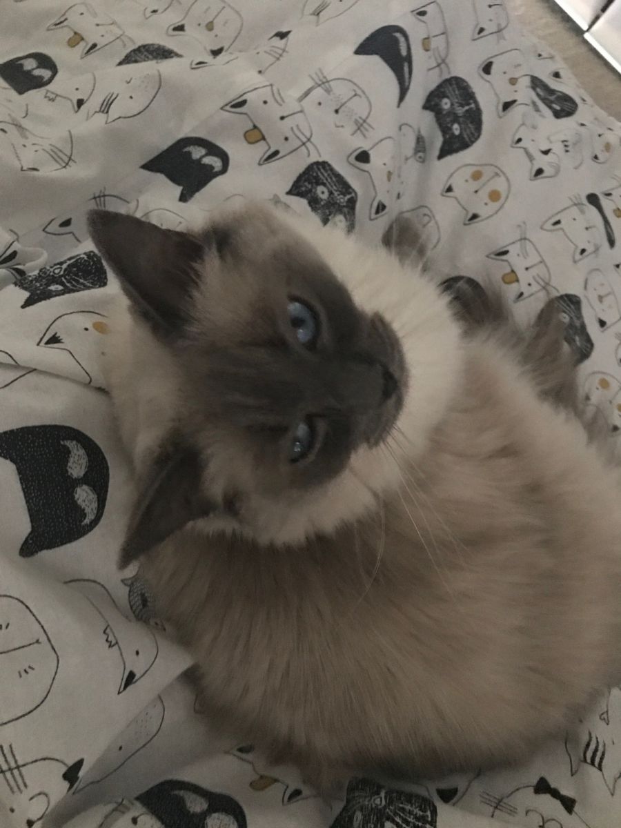 Some of his favourite things include playing with a feather on a string, cuddles, pats and being spoken to. He likes to sleep on the end of beds and on top of lounges - anywhere that is comfy and warm. He is very talkative too - if something is not right, you'll hear about it. He's also a bit of a watch-cat and likes to keep an eye out on what’s happening. He mostly eats dry food, he is allowed wet food on special occasions only - as he can get a little obsessed! When he’s stressed, he loves the loose skin at the back of his neck massaged.