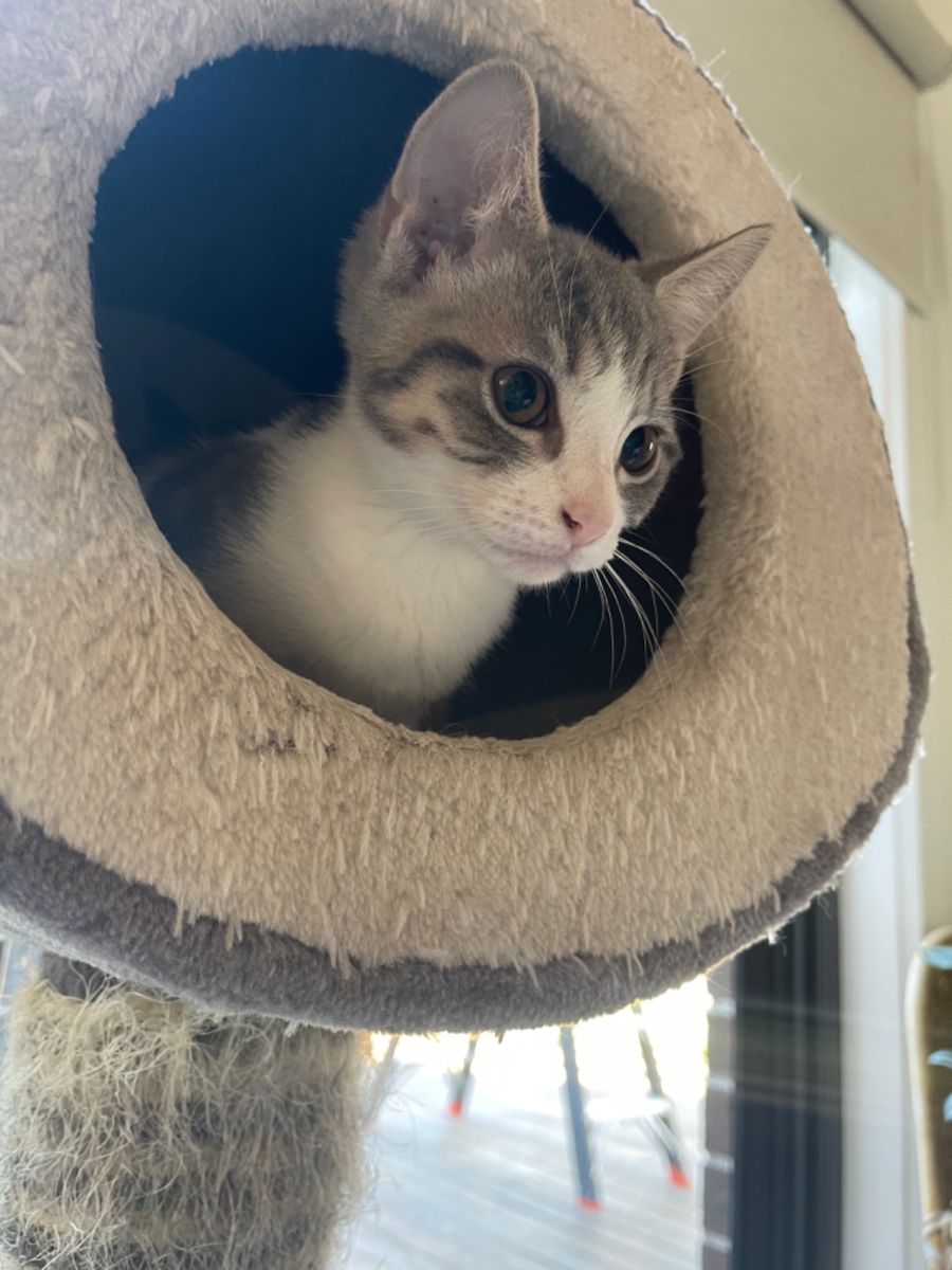 Hello I’m Daisey! My foster carers tell me I make them laugh allot with the games I like to play when I jump up with a cat toy and run and hide waiting for you to come find me and throw my toy again. Im a sweet soul that’s looking for a family that will give me lots of love, cuddles and time. I love to play with other cats and kittens so if you have a home with one I would love that! I even have my litter mates on pet rescue too so if you have the room, time and love for two of us that would be purrrfect. Please enquire on my profile which litter mates are mine!