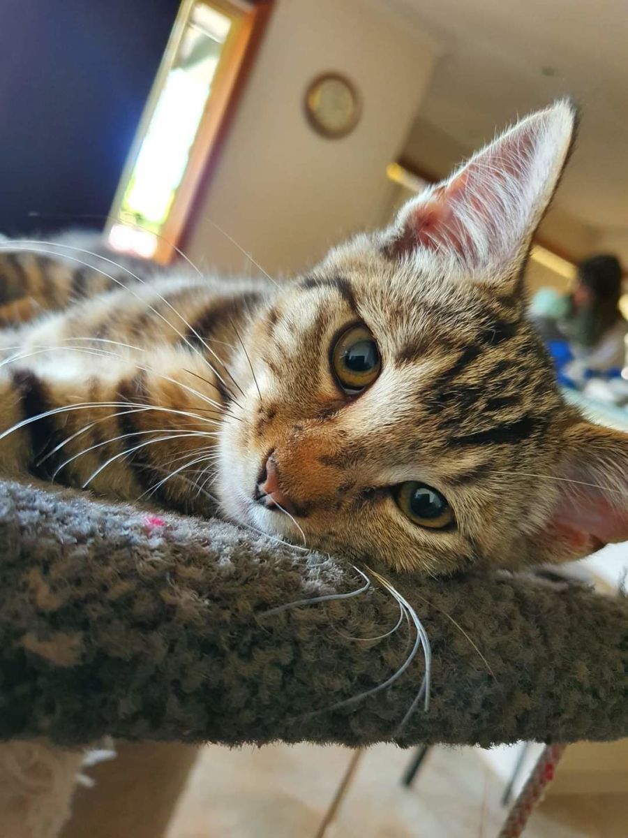 I am a perfect all rounder. I'm great with humans of all ages, other cats/kittens and dogs. I'm a very happy, friendly, playful, inquisitive and snuggly little guy with a huge lawn mower purr. I love to play and interact with anyone and when I'm done playing I will snuggle up on your lap to snooze. I am a handsome fella with golden eyes and a wonderfully stripey coat.