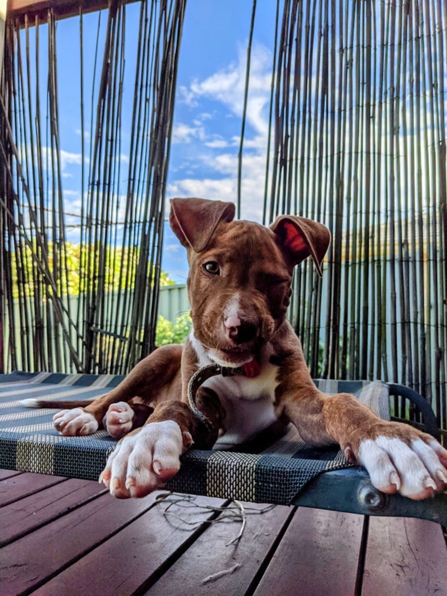 I'm a Bull Arab x American Staffy mix puppy looking for my forever home. I'm currently in care with my sister, Jinx who is also up for adoption. We love to run, climb, wrestle and chew on toys all day long! We also enjoy our cuddle time with our humans and love to show off all our new tricks we're learning for extra treats cos we both LOVE our food. Sometimes I am over protective of my meals so I will need continued guidance on what behaviours are appropriate.
