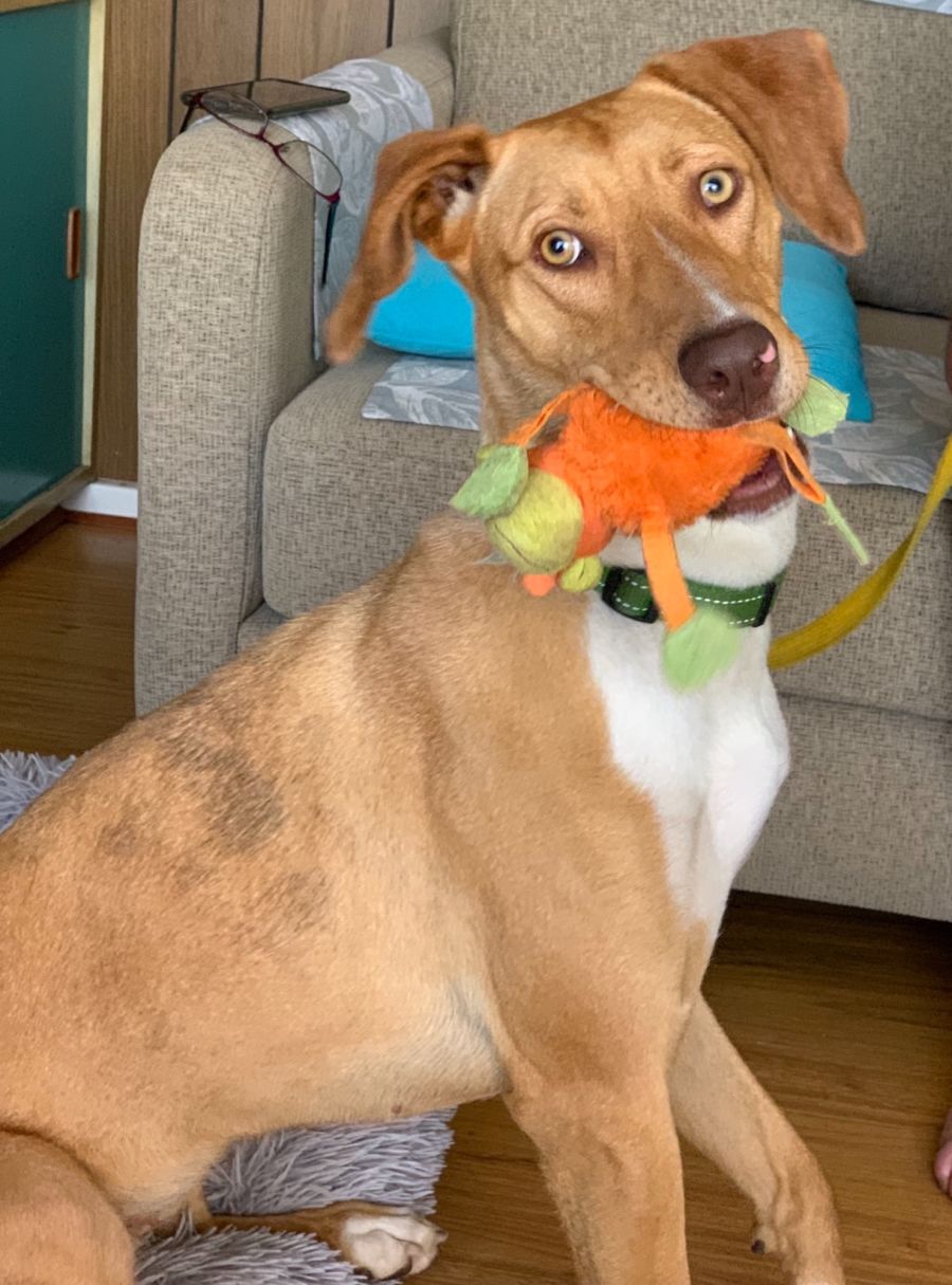 Obviously her new family will need to be very committed to ongoing training. She is at that mischievous age and has a way of looking very cute while doing those typical puppy things. You know what we man, running off with your shoe, dragging the pet bed around the floor or stealing one of the other dogs toys and being very proud of her achievement.