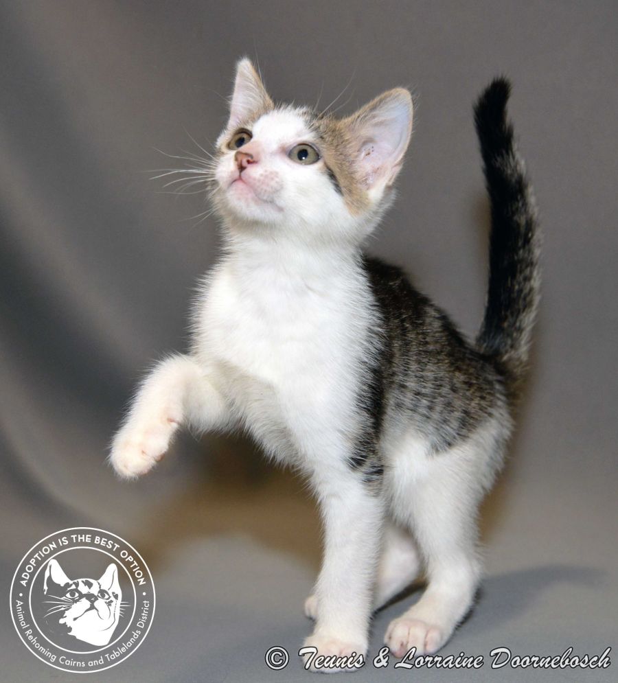 CLOVER is one of 6 kittens born under a bush in a garden and rescued by the property owner who has raised the babies for rehoming. Clover is a very curious kitty who loves exploring then, when she finds a human at the end of her rainbow, she loves to smooch and have a cuddle. Clover will be an absolute delight to the lucky family who adopts her.