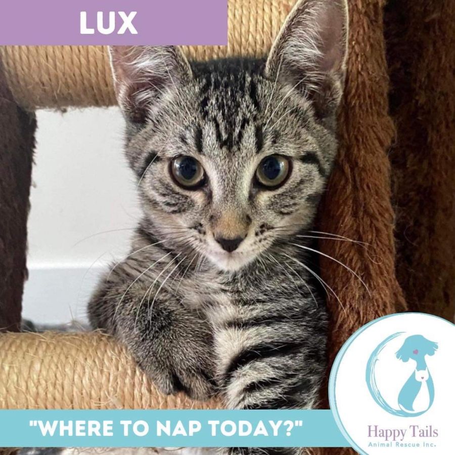 Lux is a beautiful tabby kitten who loves to sit and watch the world around him. He can often be found sitting calmly with his big wide eyes taking it all in.