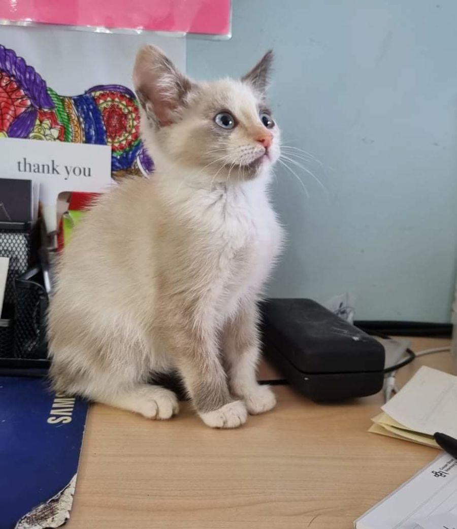 Little foxy was abandoned at a local park before being rescued & coming into care with us. She is a sweet little girl with a sassy personality. She is currently being housed with one of our other kitten Oliver. They are getting along well as Oliver is very submissive & lets foxy boss him around. She would love to go to new a home as an only cat or a home with dogs. If you have other cats she will learn to fit in, but expect a lot of sass & bossiness from her.