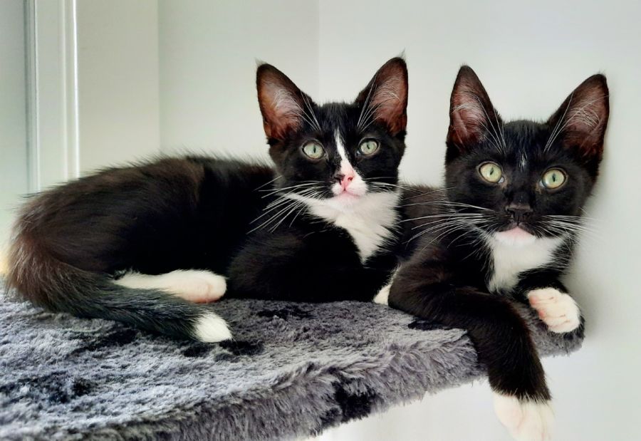 C989 Hunka Munca is the bravest and first to come running for attention. She loves to be cuddled and has mastered the art of using the litter tray properly. She has a set of lovely little white socks and a very fancy, white-tipped tail, just like her brother. She has a super special white blaze on her face, which looks like lightening as she bounces about trying to decide what to play with. Being from a litter of only two, she would love to be adopted with her brother and promises to pose nicely together in photos for years to come.