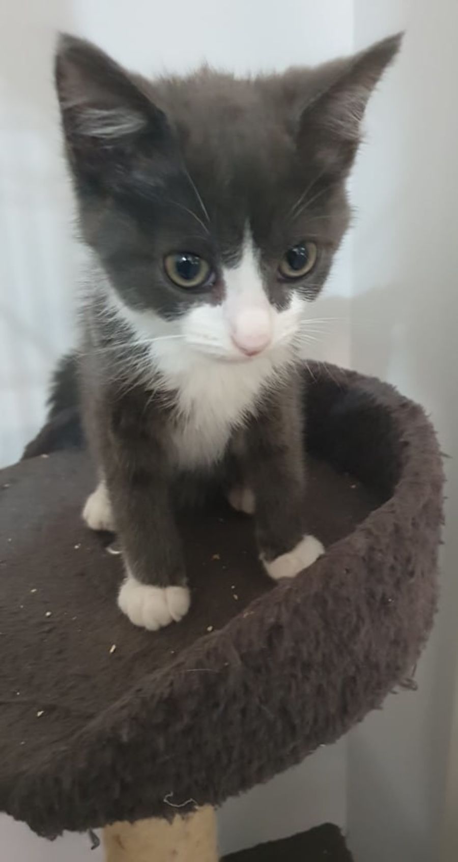 Hi there, my name is Stitch and I am very playful and crave my humans. If I see you walk past me and you don't pat me I will meow at you. I get along with other kittens but sometimes I like to be the boss but I don't hurt them. I would like a home with no dogs please because they scare me but everything else is OK.