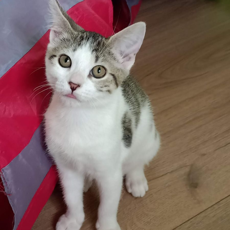 I'm a very confident and happy little tabby girl with white chest and white tummy. My sassiness & zest for life make me very entertaining. We have even started using the cat harness and I have taken to it ultra quick – but that’s me, I learn the ropes very quickly. I enjoy pats, cuddles and kisses, but only once I've finished playing of course. Because when I play, I go all out! I run and jump around and play with anything in sight. My foster mum finds it very amusing to watch.
