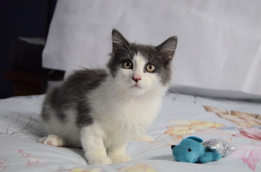 Chungis is the biggest and most adventurous of his siblings, but he is also very affectionate. Chungis was part of a litter of 9 kittens that came into care at 2 weeks old and was hand raised. Chungis is the biggest purr machine and is very confident, always strutting around with his tail straight up in the air! Chungis is a perfect all-round kitten, he’s been around older kids and while he’s never met a dog he would be fine with a cat-friendly dog that will give him space and time to get used to them. He is great with his kitty litter and has never had a accident. Chungis will make a great permanent addition to any home.