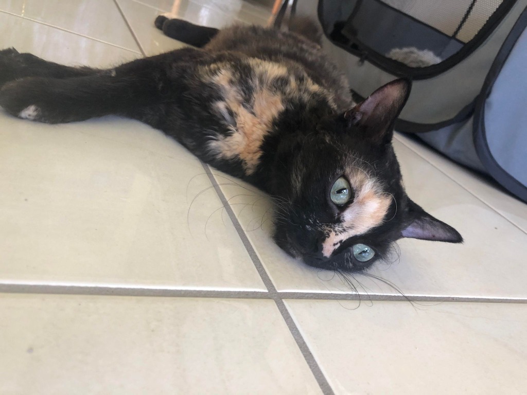 Saffron is a lovely devon rex/tortoiseshell, very active and cuddly. She loves to jump on your lap and smooch. She's very confident with other cats, dogs and small humans. Will suit either families or single people. Saffron is an inside only cat.-