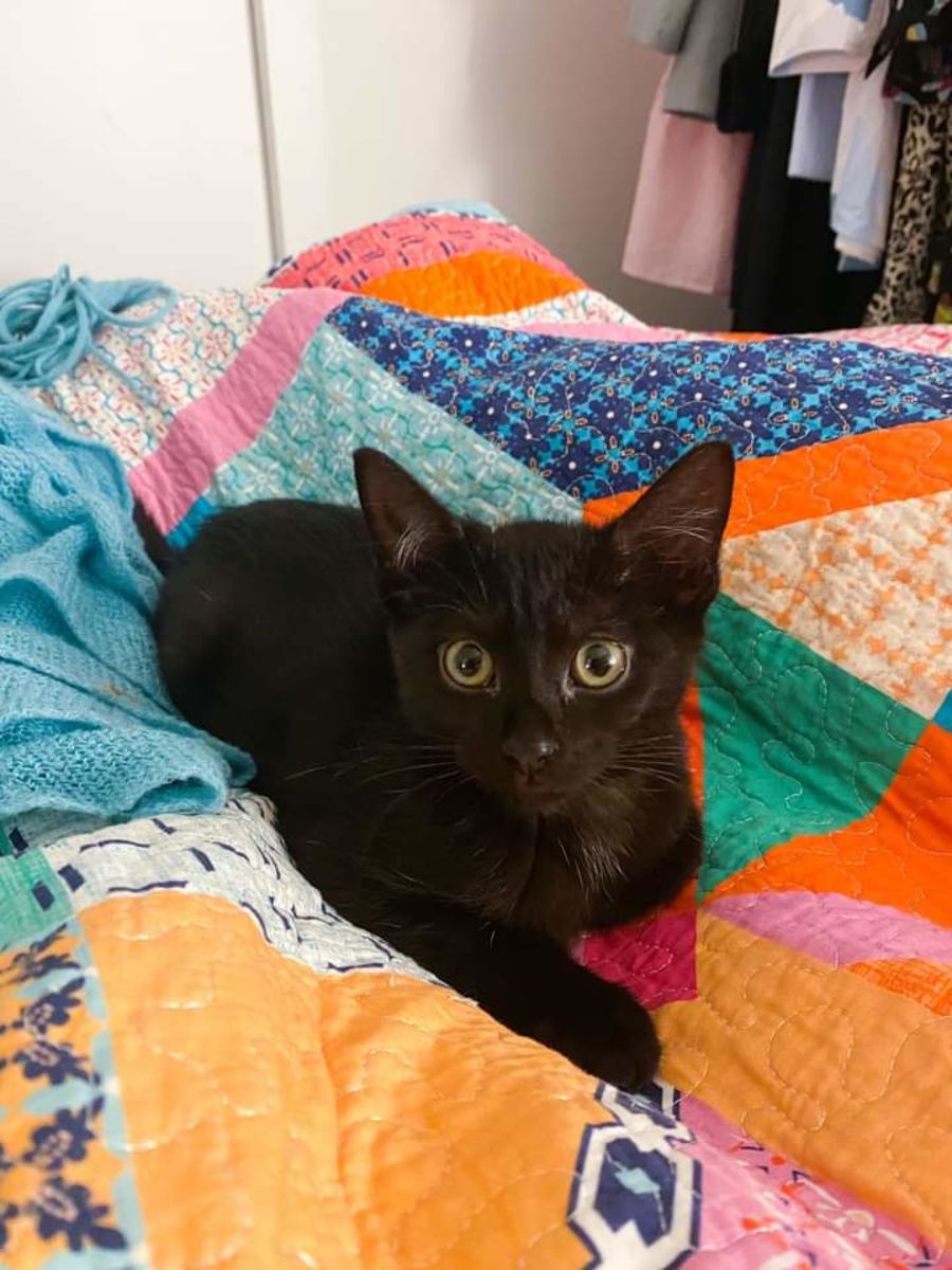 I’m about 9 weeks old and am a little bit smaller than my sister. I’m a very smoochy cuddly girl who loves being as close to my humans as possible. I wait until they’re settled on the couch and then tuck myself in against them. I took a little bit to open up but now I give the biggest purrs when I get picked up for cuddles.