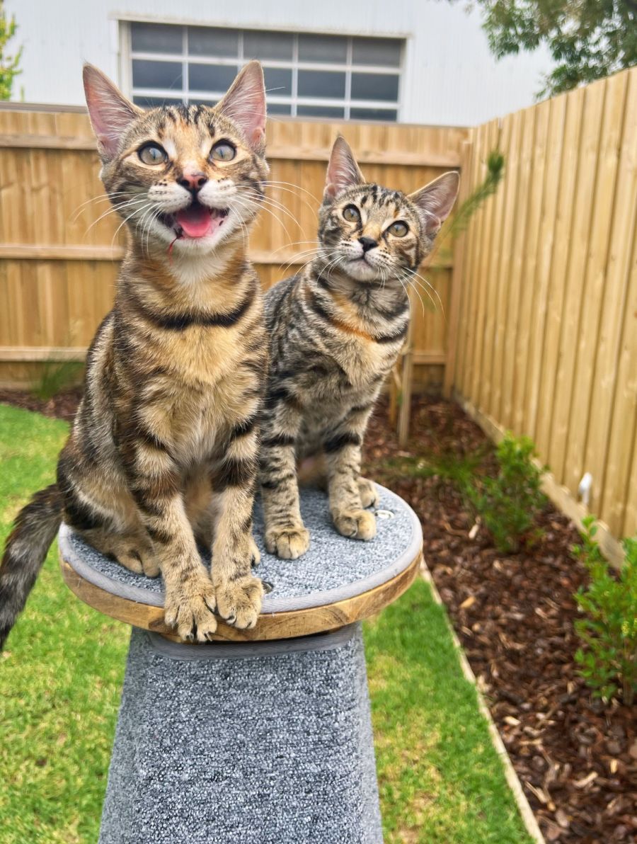 Tiffany has a beautiful temperament, she’s very laid back, independent, more introverted and also very affectionate (more on her terms). She’s very energetic and talkative (which are classic Bengal traits) and therefore needs stimulation. She is joined at the hip with her sister Phoebe and will run flights of stairs, play hide and seek in their tunnels and chase each other up towers or around the house. When she’s had enough off that, she’ll find a nice sunny warm spot on one of her towers to get her daily siesta in. She welcomes lots of kisses and pats at this particular time of the day. You will also notice her taking time out from all the kitty chaos and becomes very observant. Her energy is so calming and pure, and she looks like a beautiful regal angel.