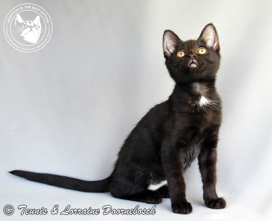 Davina is a shiny black kitty who was found wandering the streets of Atherton when only very tiny. How she survived is a wonder but she did and at first, she was a bit of a wild child. In care, she has become a real delight to be with and so smart. When all the other kitties come running to their portal for a treat before they bed down, little Davina always manages to elude capture but, it's just a game for her. After giving you the run around, she'll come to you purring and loving the attention she gets when the others are pre-occupied with the treats.