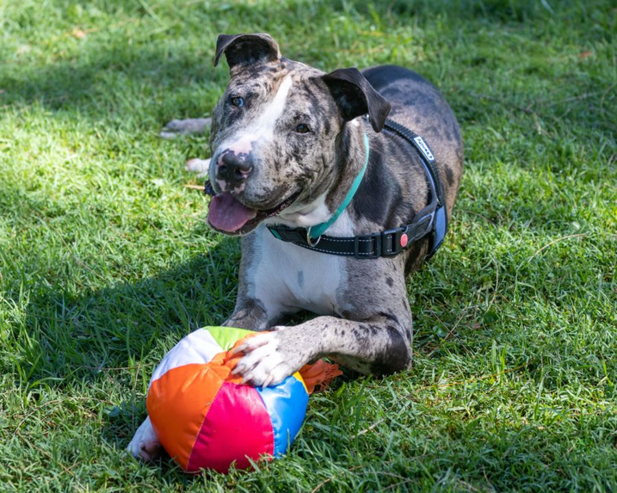 Zeus is a super sweet Catahoula x American Staffy. At just 10 months old, he is a big puppy who doesn’t realise his size. Like most large dogs, he thinks he is a lap dog. Zeus is a big baby, who just loves a cuddle and a massage. If you sit down, it won’t be long before he joins you and tries to sit on your lap! Zeus can be fearful of new people and situations, but with time and patience, he will give you his trust. He loves his food, so that will definitely help with his training! Zeus loves to play and adores his toys, especially rope toys, balls and soft toys.