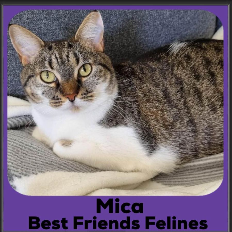 Hi, My name is Mica. It's been a bit of a rough road for me and my little family, but you wouldn't know if from my personality. I was left behind when my owners moved homes, and the neighbour discovered me and my newborn babies and took me to a vet so they could find someone to help us – this is where BFF came in. I was extremely underweight and had trouble standing and struggling to looking after my babies, but with some time, love, and lots of good quality food I've regained my strength and energy, and I can now be the young teenage kitten that I am. Yes it's hard to believe but I am not even 1 year old yet so I still have a bit of kitten left in me.
