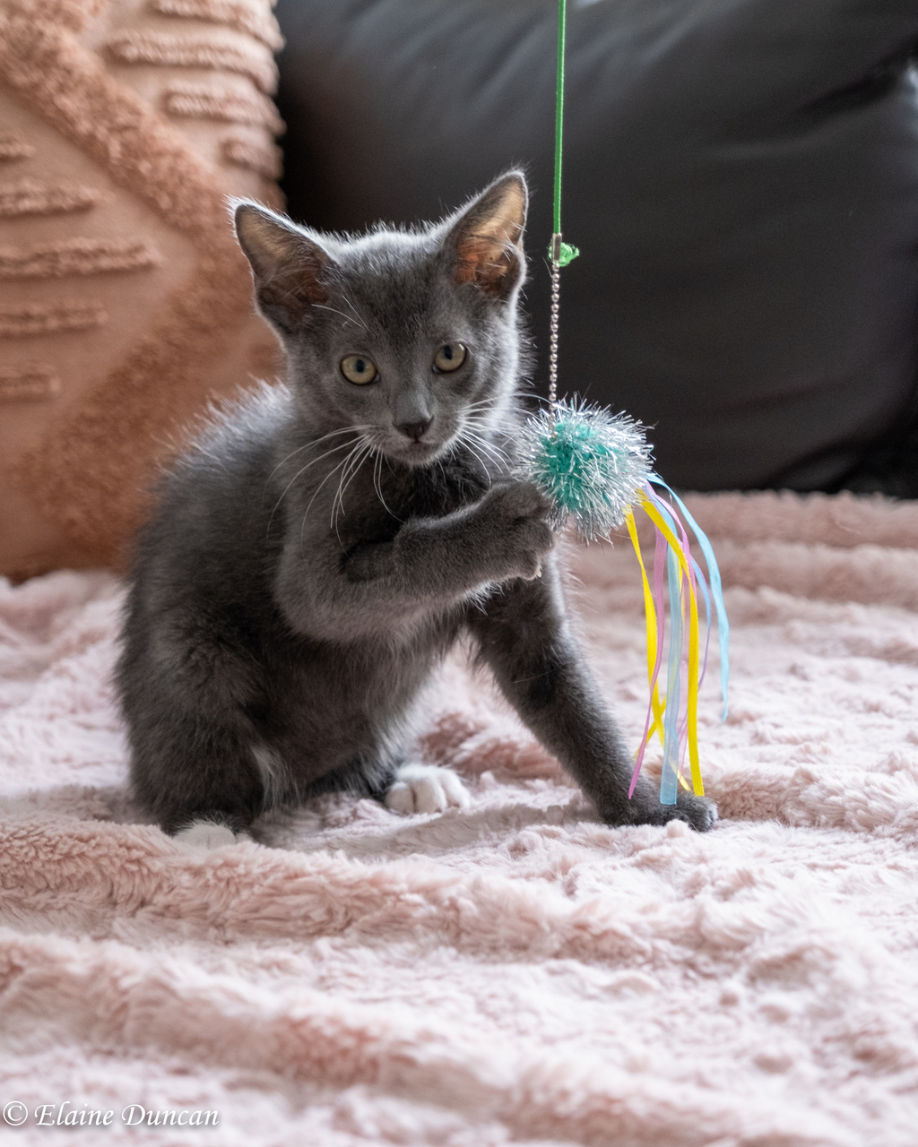 Larry is sweet, adorable and funny...everything you could want in a kitten! When he wants attention, he will let his humans know by chirping at them and winding between their legs until he is picked up for cuddles. Larry loves to be close to his human's face and will curl up on their shoulders or around their neck and will purr like no tomorrow. Larry always seems to have his little tongue poking out (cute or cheeky, you decide). Little Larry is very energetic and will play with just about anything that you put in front of him. He loves other cats as well as dogs. Larry is particularly close to his brother Dwayne and if you happened to be in the market for a pair...they would make an excellent kitty duo.