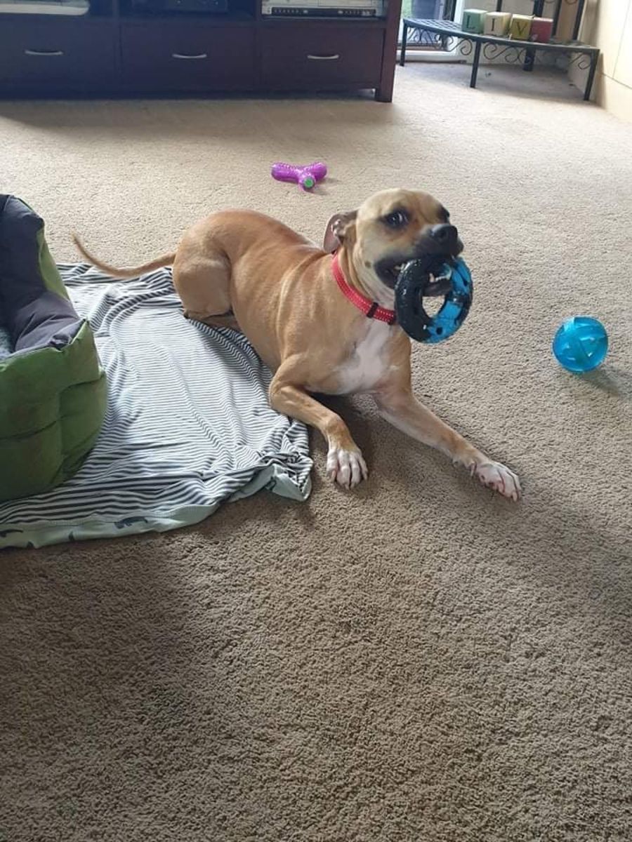 Totally housetrained, loves her toys, loves her humans ( is quiet when she meets you but warms up quickly)