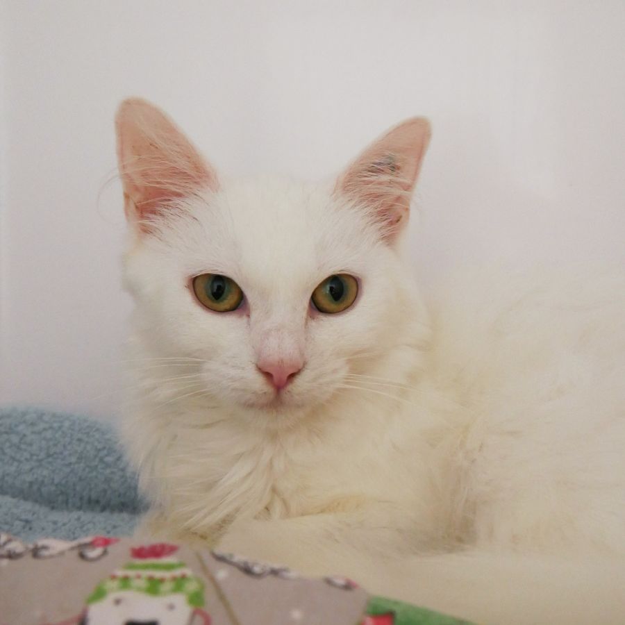 Her perfect home must be indoors only due to her white ears and pink nose, a home that is calm and quiet without children or canines.