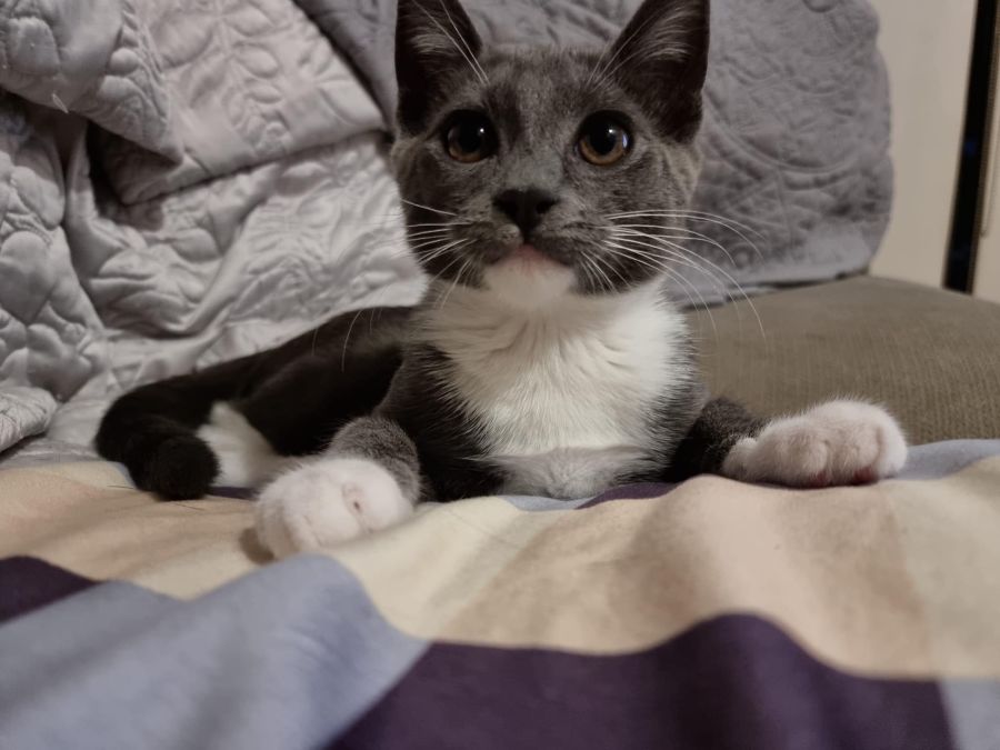 From a terrified kitten that would stiffen up when held and would run and hide if you walked into the room. He now seeks out the people to boop their elbow and run away, only to return to do it again.