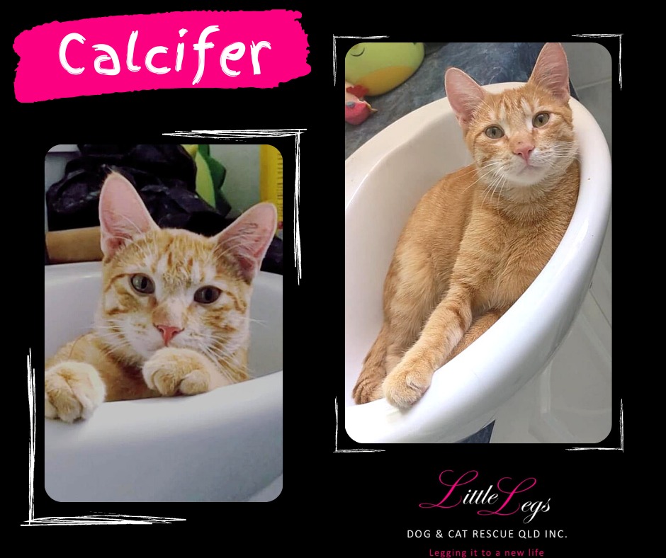 My name is Calcifer; I am a playful, loving, and squeaky little boy. My hobbies include playing chase and wrestling with my foster siblings big & small, playing all kinds of fun games, munching on cardboard boxes, getting lots and lots of kisses & taking long naps in the bathroom sink.