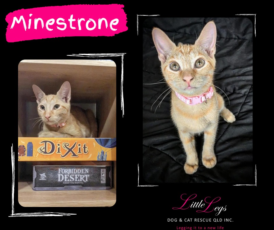 Minestrone also loves to play & hunt all manner of toys, he is a natural born hunter who will not let his size stop him from taking down even the biggest of teddy bears while exploring the harsh wilds of ""Loungeroom"". You will fall in love with this little guy the moment you meet him.
