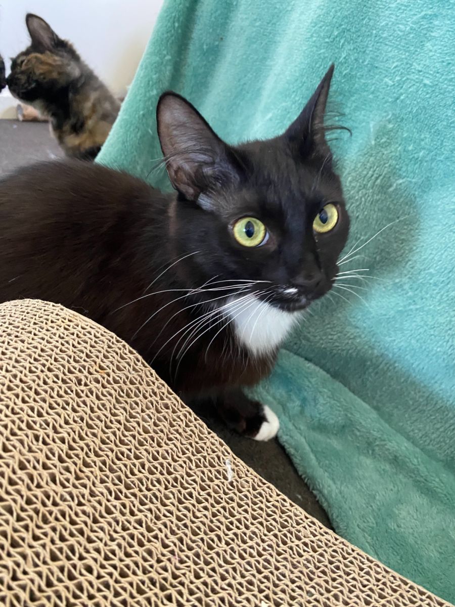 Maeve is incredibly gentle and receptive to humans; she has likely lived with one before she arrived in foster care. Maeve is still very young and as such enjoys some good play time, especially with her kittens – she’s an incredibly doting mum! Maeve would prefer a home by herself or with one her kittens (Keira, Reyna, Priya and Arna) but is not very keen on any canine friends. She is also scared of road traffic so an indoor lifestyle would be best for her. Maeve makes an excellent companion and is always around if you want to chat. She’s been waiting very patiently for her forever home but she’s ready to meet the people who will spoil her like the queen she is!