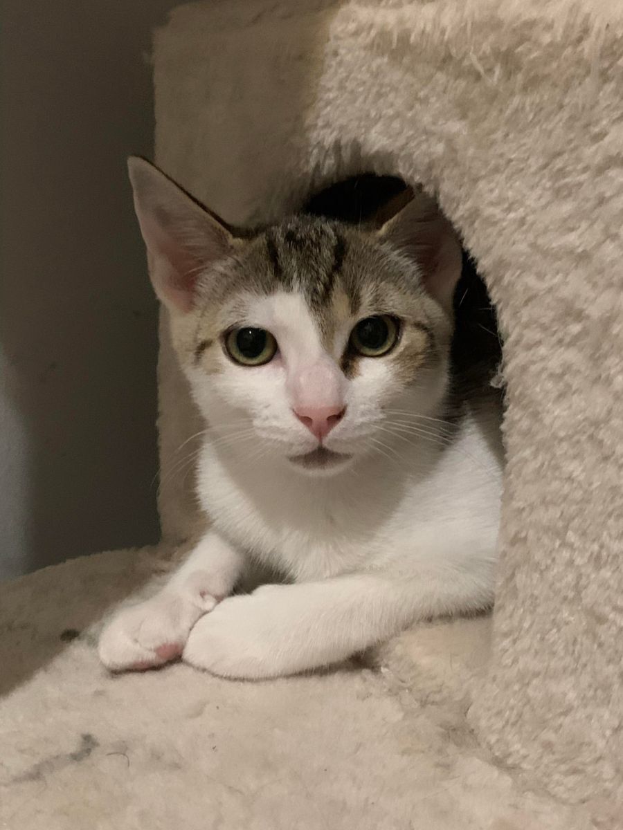 I lived on the streets until I was about 7 weeks old. I found my new home terrifying and its taken me a little while to get use to it. I find people a little scary but I loved getting my cheeks scratched.