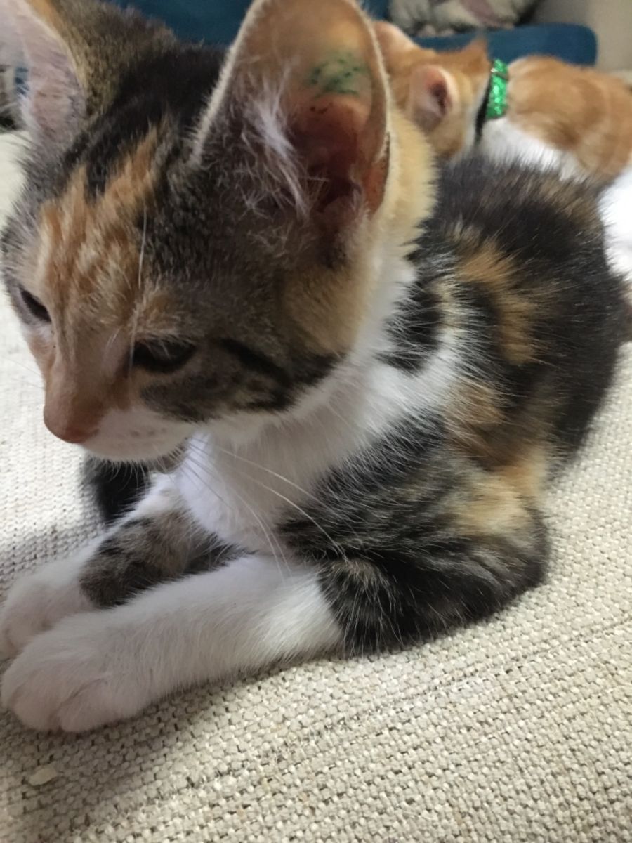 Isha is litter-trained and has been well-socialised in my home. She is eating Royal Canin Kitten food, both wet and dry, with lots of clean water always available.