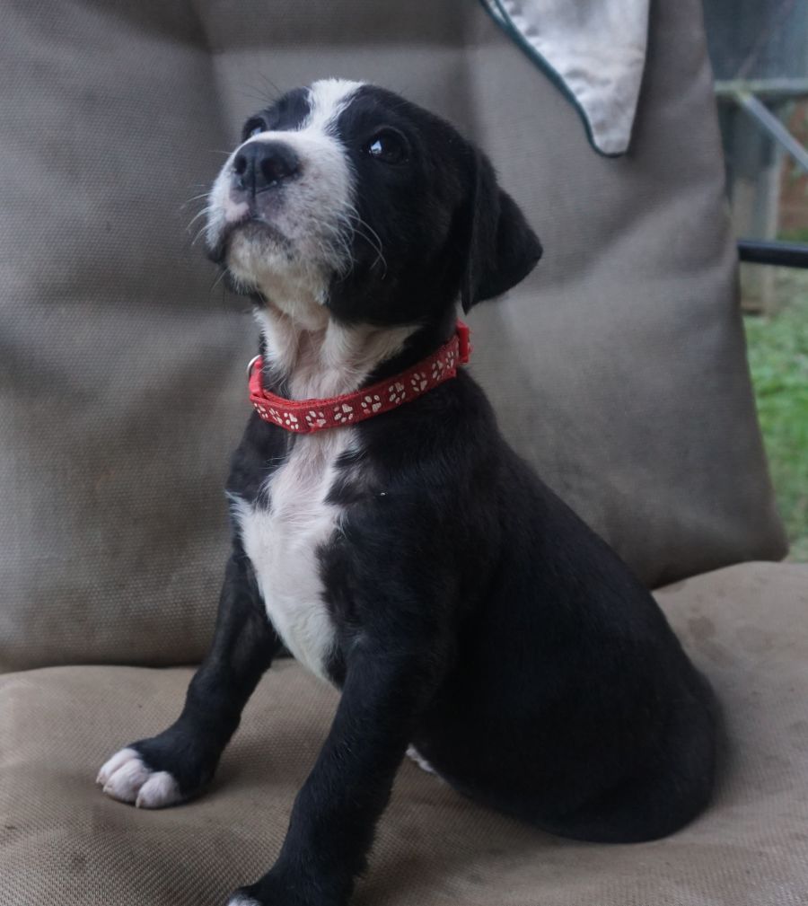 I’m an 7-week-old border collie/staffy/unknown cross breed. I’m one of 11 puppies known as “The Spanish pups.”