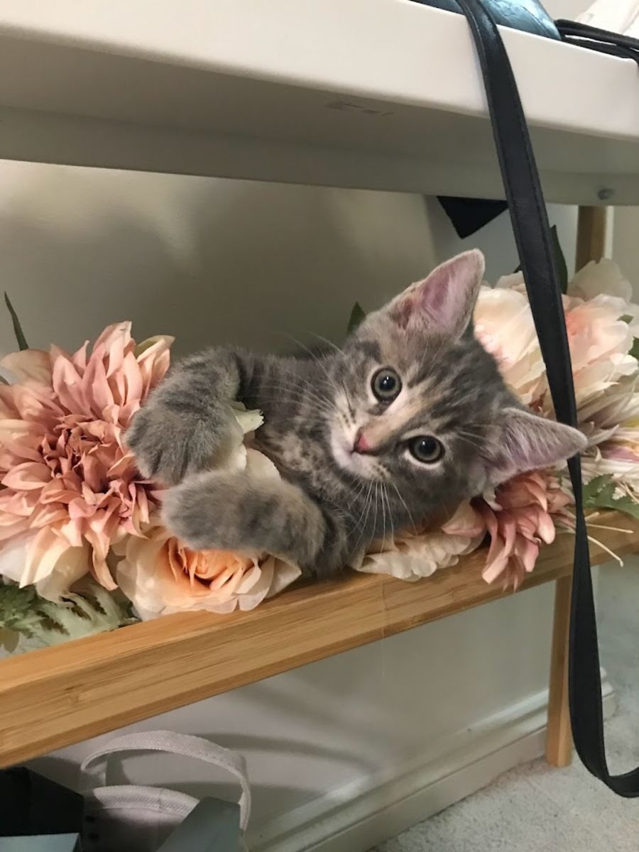 Dotti (tortie/grey tabby) was named after Dorothy Young, the assistant to Houdini. Dotti was very good at hiding and disappearing from sight in the first few days.