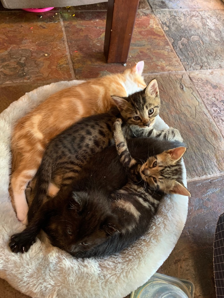 Violet is the gentle soul in the house. She’s quieter than the other foster kittens we have, and I usually find her tucked up in the corner asleep with Ruby or by herself. She comes over for a cuddle when you call her, and loves a good fuss, but isn’t as much of a lap cat as the others. She’s very adventurous at times and you’ll often see her dart across the room to pounce on a toy or her sister’s tail! She tolerates my kids, and will happily be picked up and cuddled by them, but I get the feeling she’d probably be happier with older kids or adults.