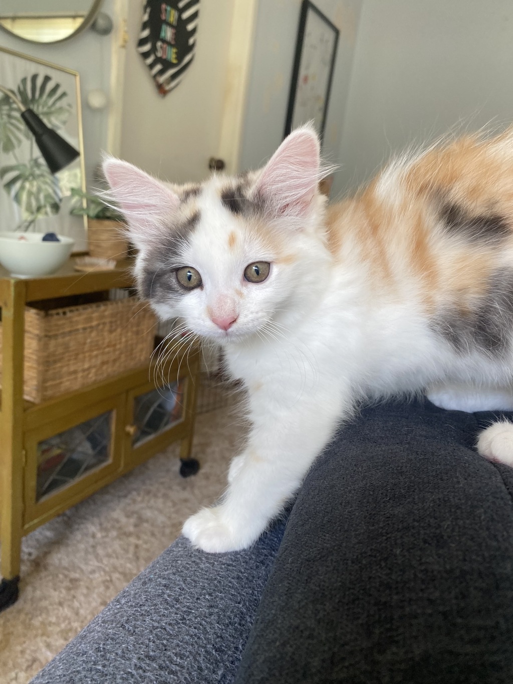 Tinsel is the paler coloured calico. She is round, fluffy and squishy like a cuddly toy, but when you snuggle her and squidge her too much, she seems rather put out. She likes to think she is very fierce and dignified, but she's actually the one most likely to fall of the couch or walk into a window. When not tearing around playfully, she crashes out hard, often on her back with all her legs in the air. She is hilarious and a true cutie-pie.