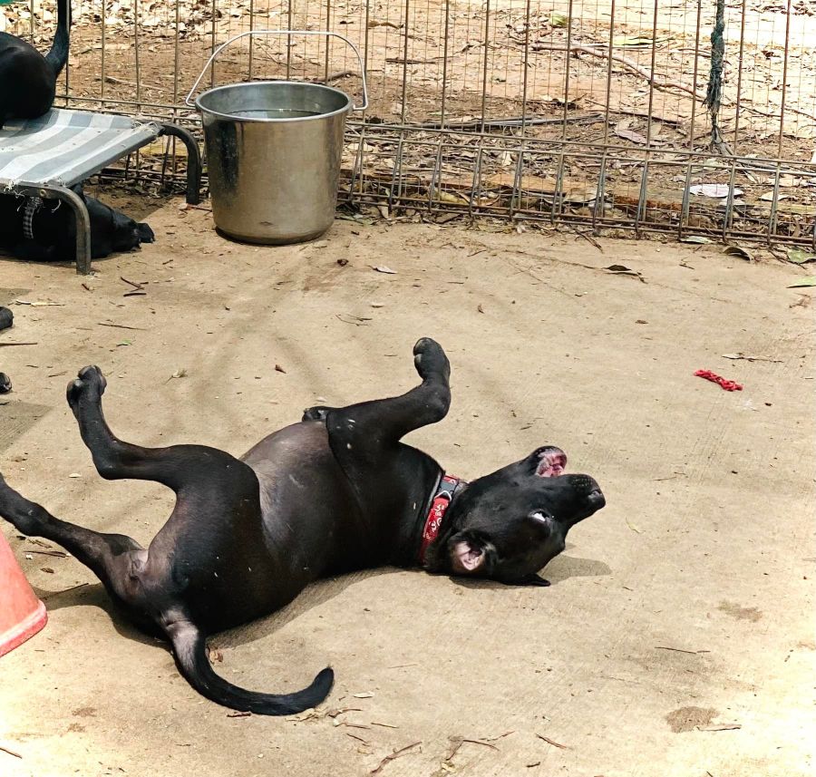 Davina has a red collar with bows printed on it. There were 10 pups born one died at birth one was kept by the owner and all 8 girls were surrendered to happy paws as mum would not have anything to do with them anymore. Their mother was an English Staffy and Dad a Roti with a bit of lab thrown in for good measure. They are all lovely friendly smart playful pups due to their colour very hard to tell them apart.