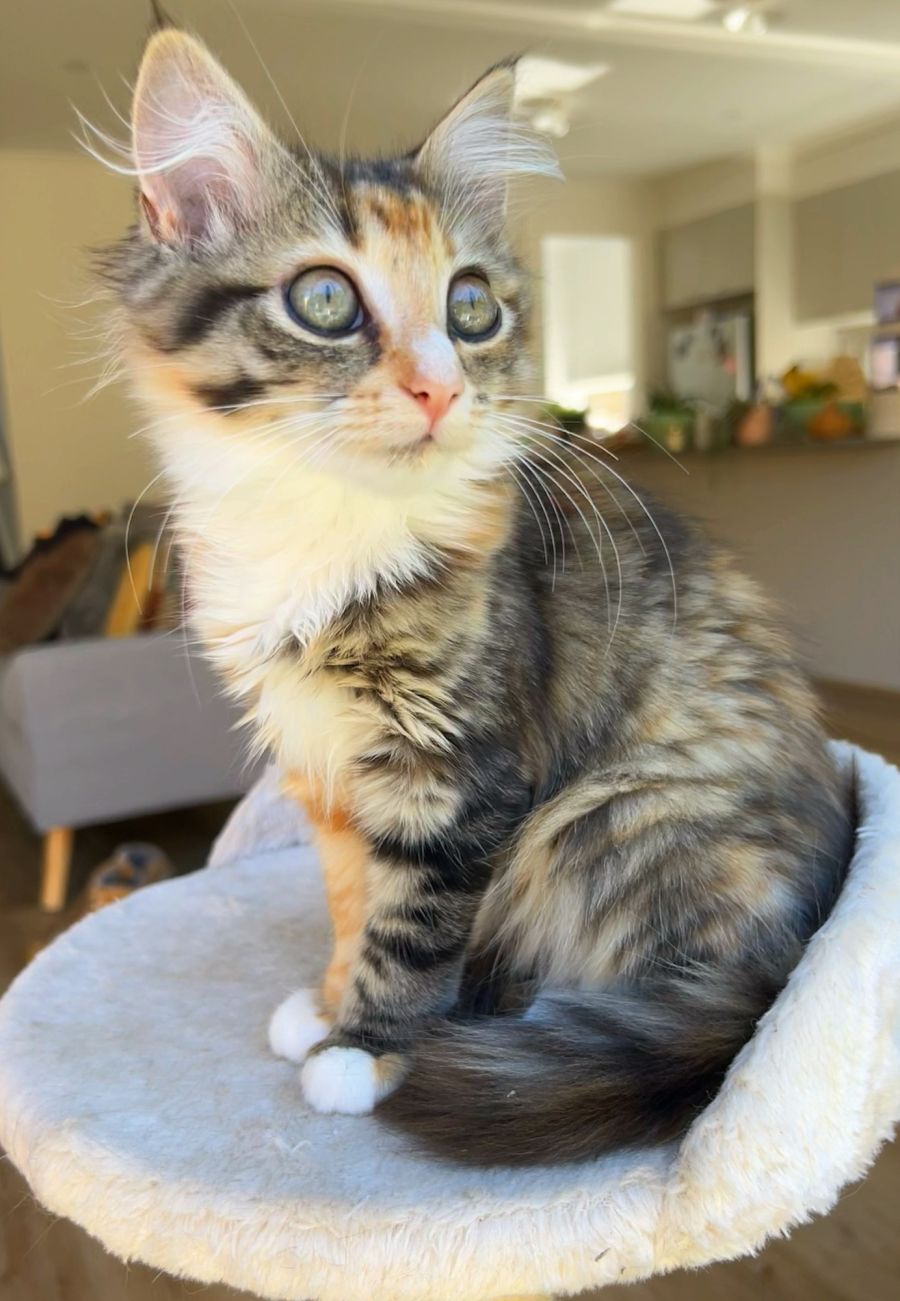 Dayley’s personality is still quite reserved and introverted but once she feels comfortable with you, she is a die hard snuggle bug who can’t get enough attention and affection. She’s super independent when it comes to playtime and can’t get enough of the ball maze games, hide seek, chasey with her siblings and taking them down or zoomies up and down the cat towers. Once she got little to no energy left, she wants your love. She’ll pop her fluffy little head around the corner and look straight into your soul with her big beautiful eyes and pretty much ask for pets and kisses. She is very loving and can become quiet demanding with her soft little chirps if the affection is not coming in quick enough.
