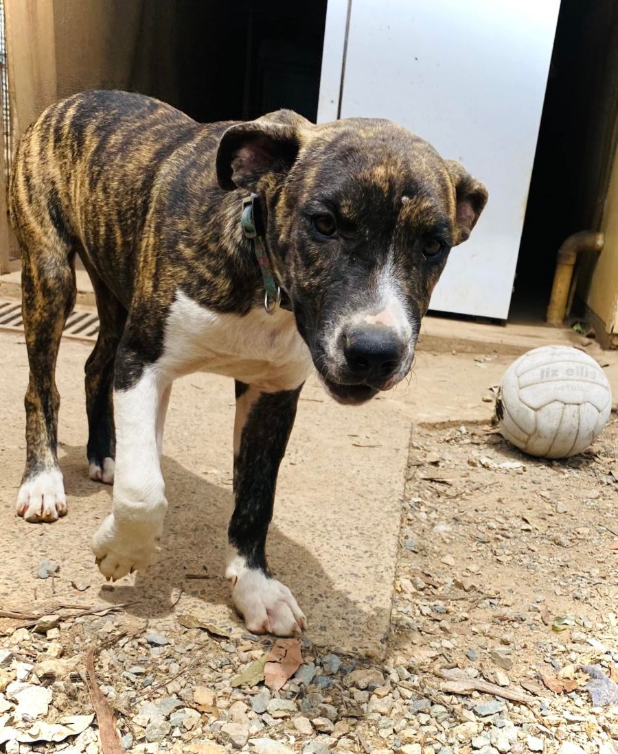 Honor came to Happy Paws with 3 brothers and 2 sisters a litter of puppies surrendered as their owner could no longer look after them. Mum was a dane/Bull Arab and Dad Neo-mastiff. An interesting phenomena is that all the males have a crooked tail while all the females have a straight tails this interesting twist makes no difference to the boys at all as they manage to wriggle them in an endearing way. These pups are going to be big boys and girls but with lovely natures and smart. They need training as all pups do a commitment to their continued socialisation and to be very much a part of a family pack.