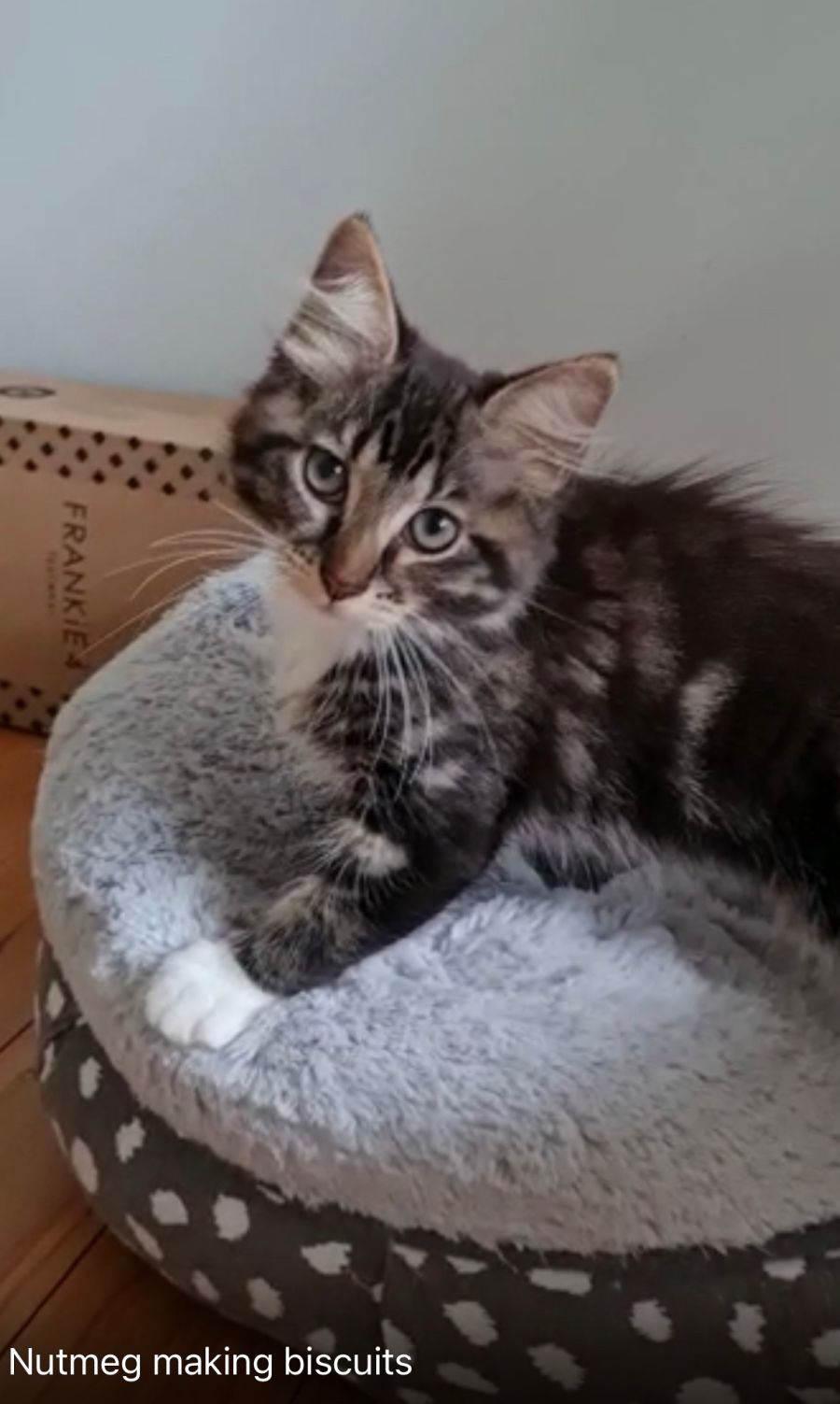 Nutmeg is very playful and loves to race around the room chasing toys. He is very comical and looks a bit like a wise old man in a kitten's body.
