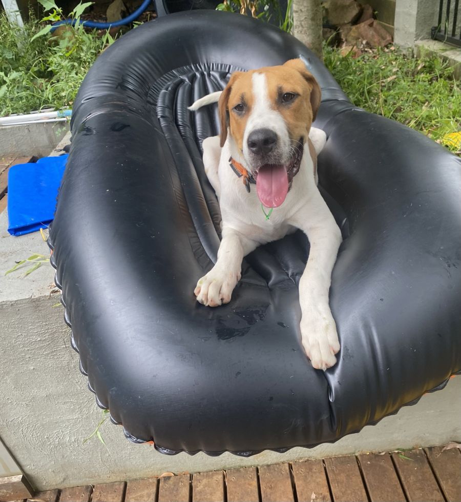 George is an 8mth old foxhound x. He is a happy go lucky boy who loves other dogs and will play with anyone who looks at him. George is currently living with 8 foster dogs and they all love him. He is a delightful boy who loves a chat and talk to you when he has something to say. He is learning how to catch a ball. George is a great family dog as he is great with kids.