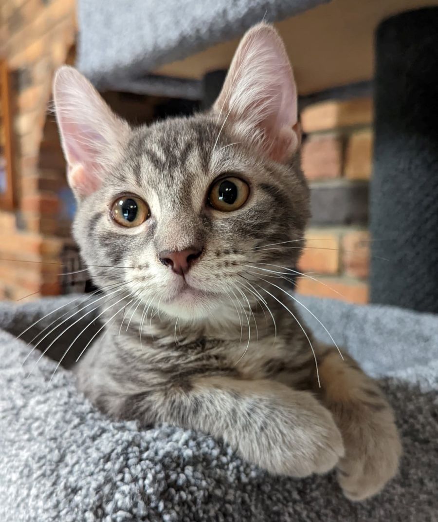 He eats well and is litter trained. He lives with an older cat who he is respectful of. He hasn’t been exposed to dogs or children but should come around if introduced respectfully. He is a happy and healthy 4-month-old boy.