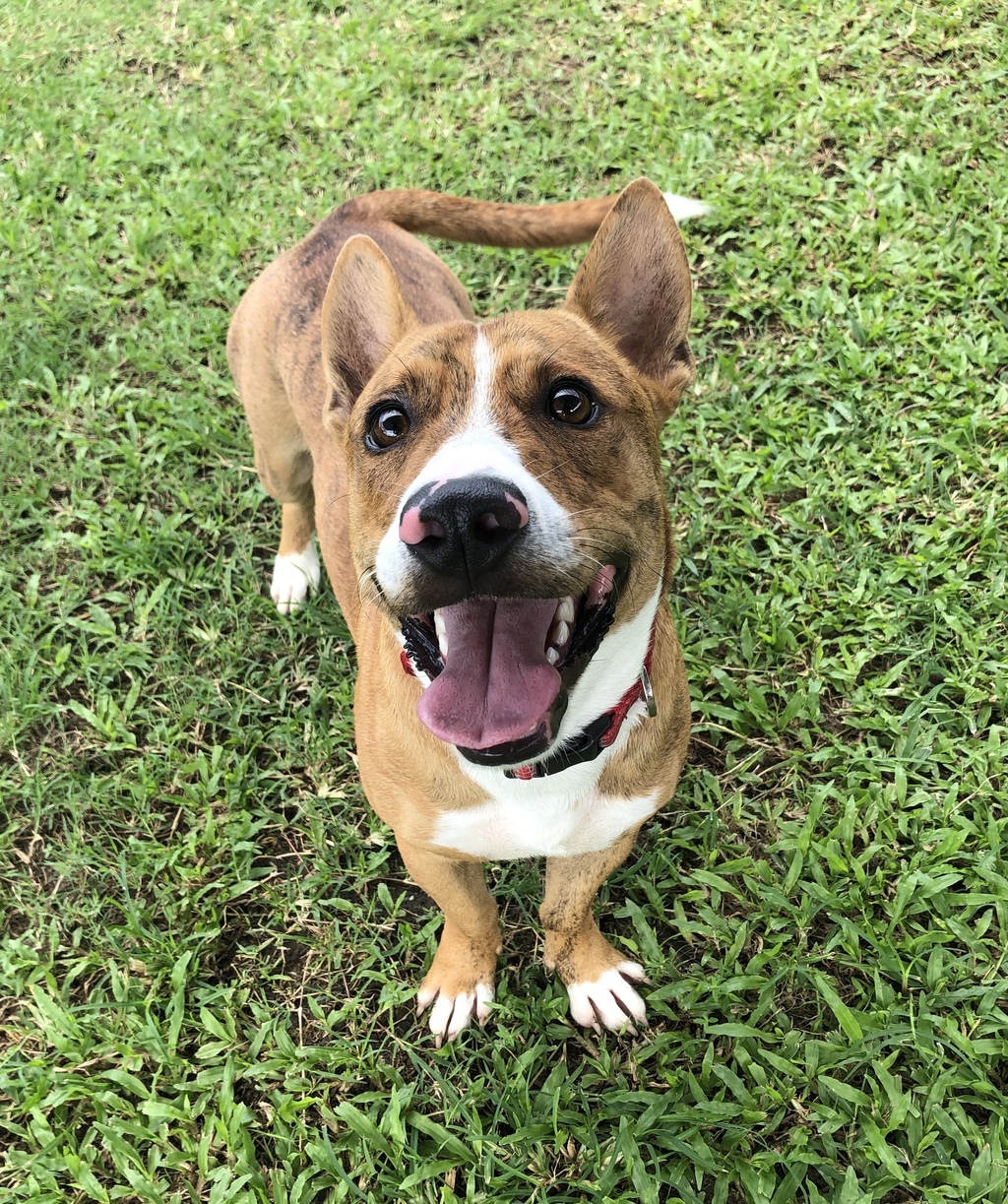 Hey there, I'm Cheddar! I am a loving boy, who always has a smile on my face. I have the cutest little white socks and touches of brindle through my fur.