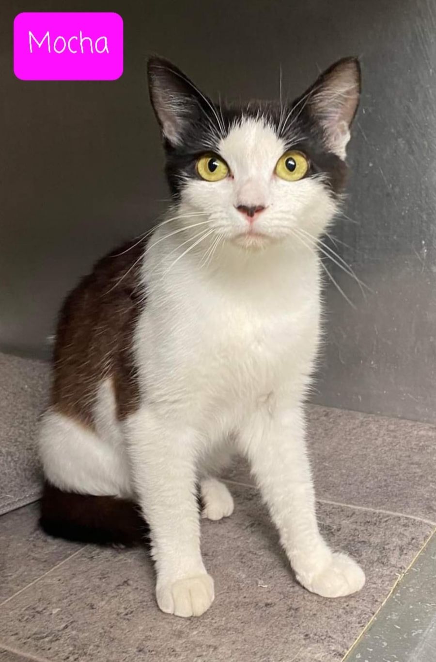 Mocha has been estimated to be around 9 months of age. She came into our program after being trapped and spending her 8 days in the pound waiting for her owner to come and claim her. That didn't happen so she came to PARH. Mocha was certainly owned by someone previously as she is very affectionate and loves attention.