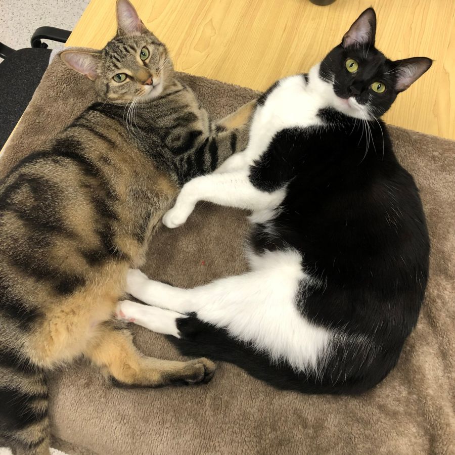 Sasha is the black and white lady and I am her tabby brother, Chips. We have always lived together and are very bonded, so we are seeking our future home where we can continue to keep each other company.