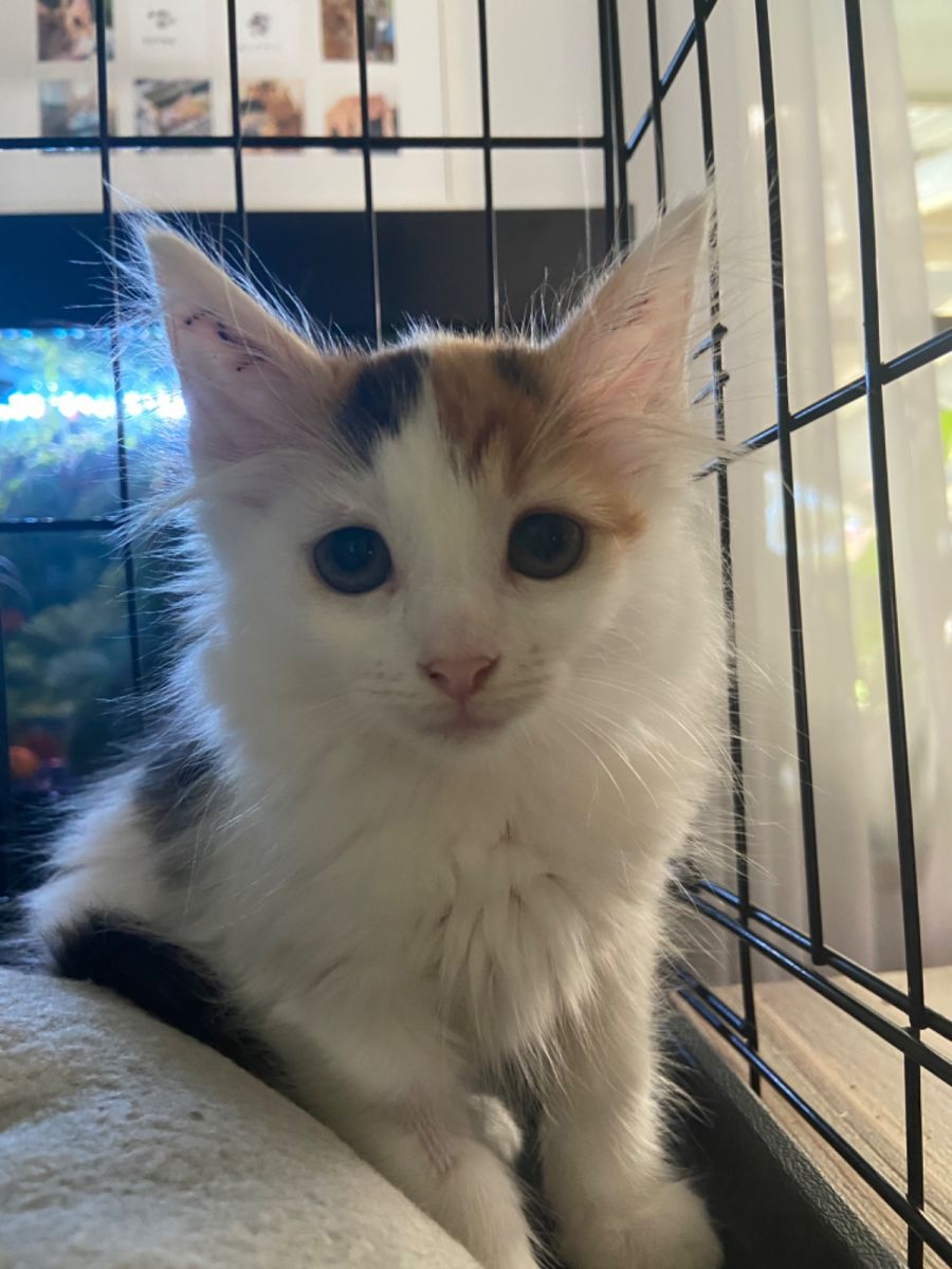 Bunny (calico) and Nemo (tabby and white) are gorgeous fluffy sisters who are still very tiny and a little shy, but are very curious and starting to come up for pats with the loudest of purrs! They’re used to other cats and big dogs so will suit almost any home with a little bit of patience.