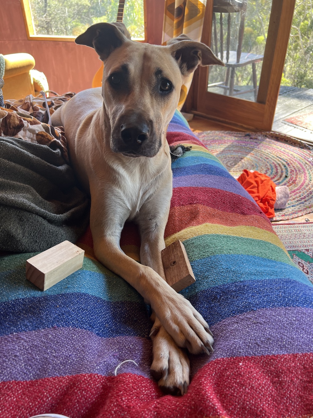 BONNIE is a lovely 1yo [DOB 28/1/21] female medium sized dog with a lovely cream coat and very athletic build. She is an active dog who loves her walk, is good on a lead and likes other dogs. Bonnie is house trained and is happy inside after her walks. She is very loyal and will stay near her owner and comes when called. Bonnie will sit, drop and fetch. Her owner is ill and can no longer care for Bonnie as a young dog needs so Bonnie is a very sad and reluctant surrender. Bonnie is Lifetime Registered in NSW and is desexed, chipped, vaccinated, flea, worm and tick treated.
