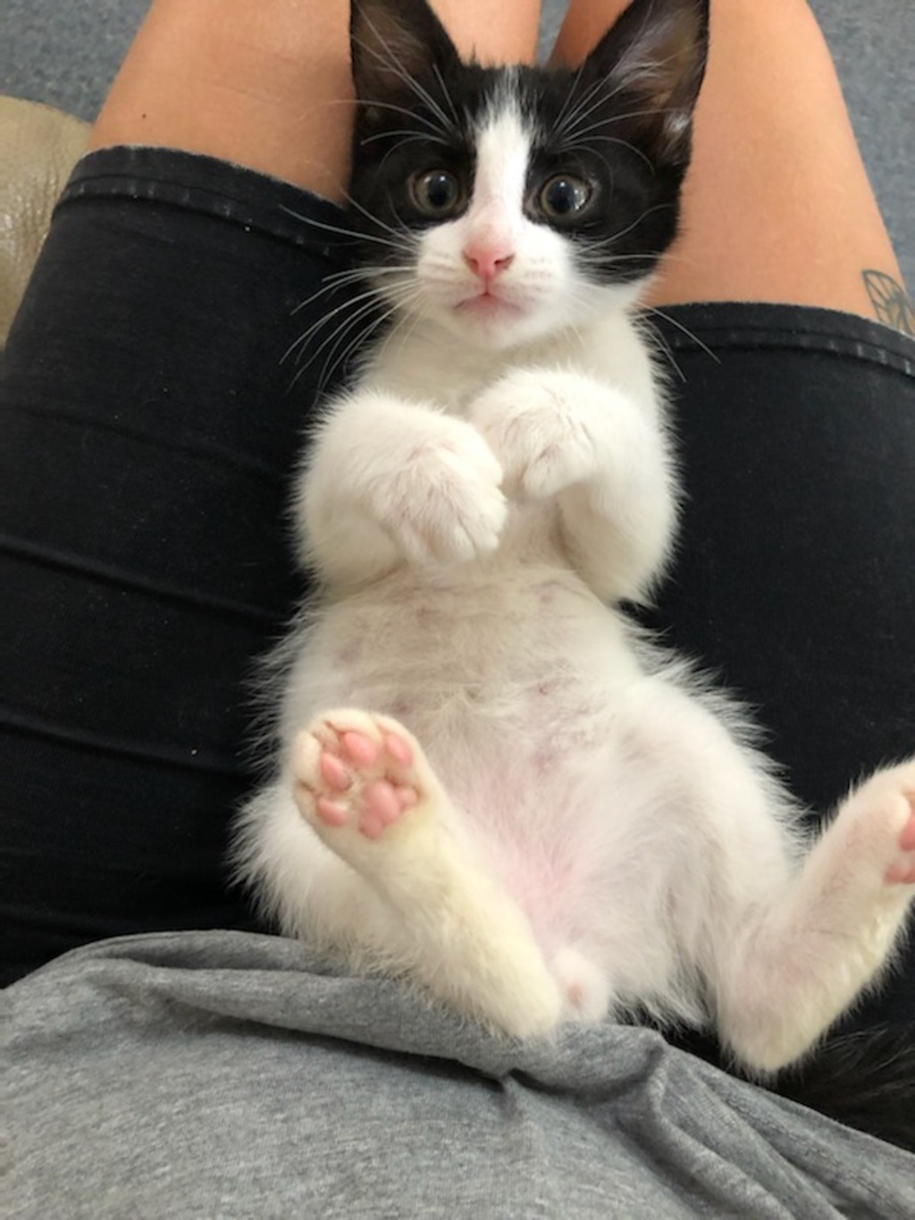 Berry is the extremely cute little dude wearing the Batman mask. He is quite definitely the class clown. Berry loves to explore and is a very efficient climber, having been found on more than one occasion in the rubbish bin having climbed up the bin liner! He is very motivated by food and first to come running if a food packet can be heard being opened, even if it is not kitten food. He is also fast...very fast...so be careful when you open the front door! Berry loves to play and is particularly taken with anything shiny, even including necklaces and rings. Berry and Custard (his sister) have lots of fun together, however, Berry also loves humans, including the kids in the foster home. He is bundles of fun and entertaining to the max.