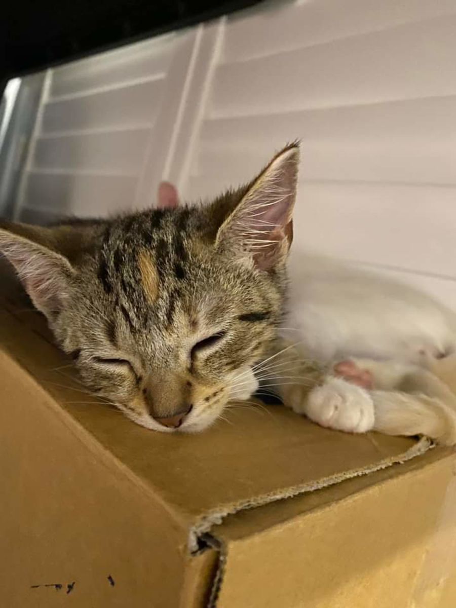 Well hello there! My name is Minx 😻 I’m a 12 week old tabby girl. I am very independent and happy to play on my own, foster mommy says it’s because of my big personality! I play with pretty much everything, but oh I do love empty boxes😊When it comes to cuddles I love being stroked and I don’t mind cuddles, especially when it gets to nap time😴 I have a very playful nature and will keep you entertained with my shenanigans, you should see my ninja jumps! I’m potty trained and will eat kibble and those special yummy soft food that comes in pouches. Sleep time is not a problem, I am happy to find the perfect spot anywhere in the house and that includes foster mommy’s bed😇I’m currently staying with my siblings and mommy so used to other cats but I’m not sure of dogs so might need a slow introduction.