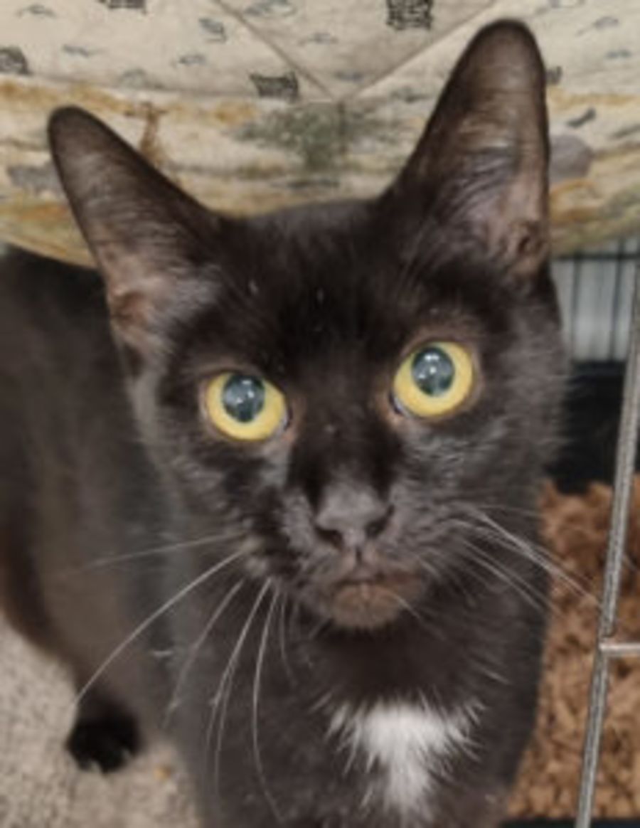 Smoochie was more or less a kitten herself when she had her own kittens on the street. Her kids have been rehomed and now some lucky person gets to take Smoochie home with them. All black with a cute white mark on her chest, she chirps in greeting whenever anyone passes by and she loves to speak up when mealtimes approach.