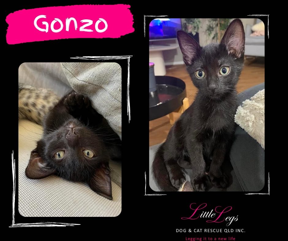 Hi everyone, my name is Gonzo. I am a happy, affectionate, playful little guy. I love to play with toys and chase them all around the house, but when I’m done I love to lounge by the window in the sun. If you want a little best friend to hang out with, I’m your guy! If you’re eating, I’ll be there If you’re sleeping, I’ll be there If you’re on the toilet, I’ll be there I really will just follow you all around the house, I love being close to you! I am a really affectionate little guy, I love getting pats and standing on my human, I will always be close by, usually having a snooze. I love attention, I will purr and meow and rub all over my friends, but I’m also good with other cats and dogs. I love my sister Kermit very much, we snuggle up and groom each other every chance we get, if you wanted to adopt us together, we would love that very much, but if not, we will happily learn to be independent kitties. Sometimes I don’t photograph very well being a black kitty, but in person I am the cutest, friendliest little guy. If you want a little best friend to give all your love to, please apply 🐾