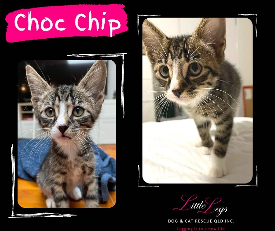 Hi, my name is Choc Chip and I came into care with my mummy and my 6 brothers and sisters. My whole family was rescued from death row. I have now moved away from my mummy and live with a new foster family with my brother Junket. He is also up for adoption in case you wanted to adopt him too. I am a super confident, but tiny kitten who loves to hang out with all the people here. I want to be with them all the time and I get sad when I can't. This house has a cat tunnel and it is so much fun to run and hide in there. I love playing with my brother and my foster family. I cannot wait to find my new family. I am very flexible on what that may look like. I just want to live with some people of my very own.