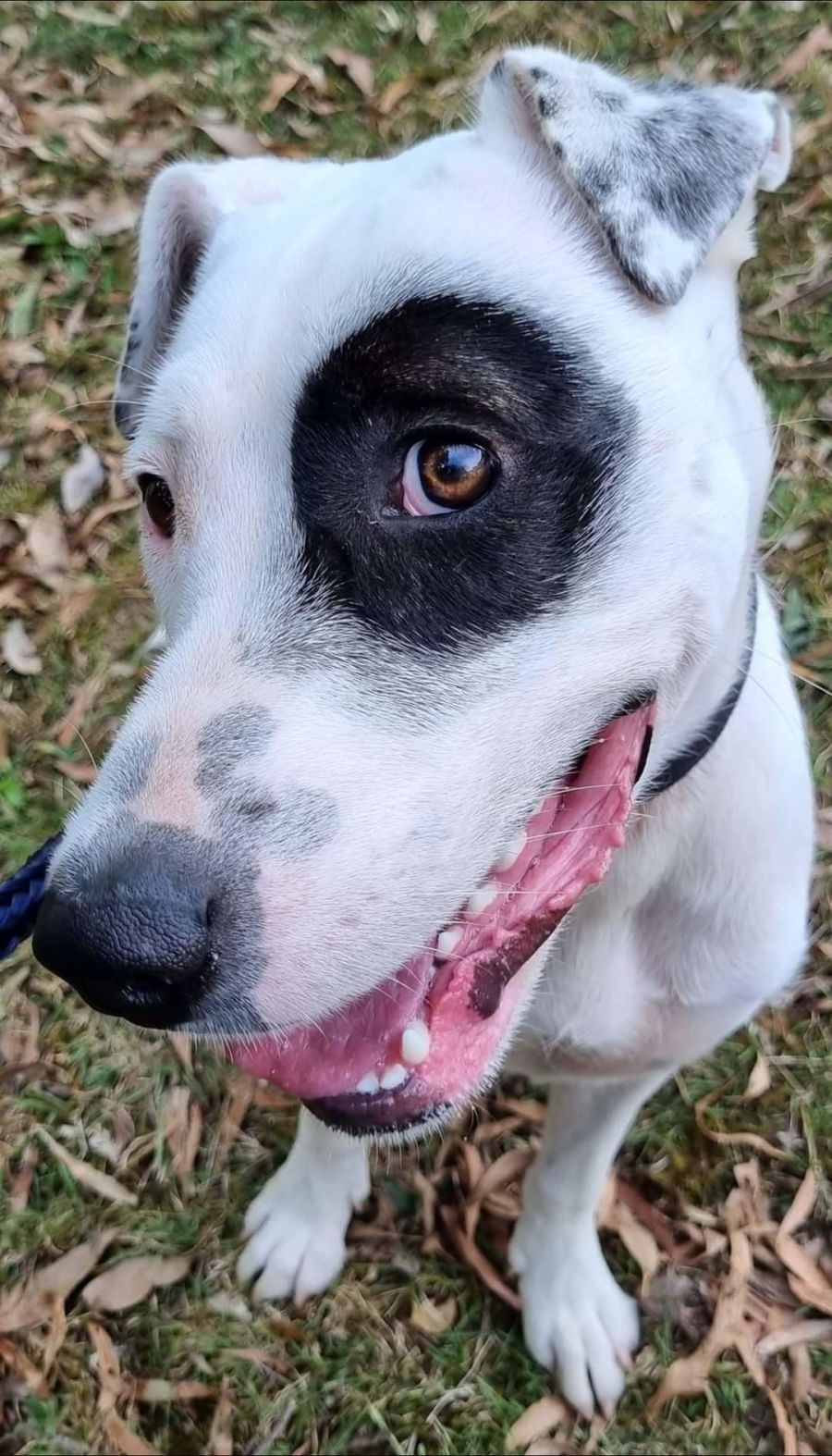 I am a one year old Bull arab with tiny ears a big black patch over my eye.