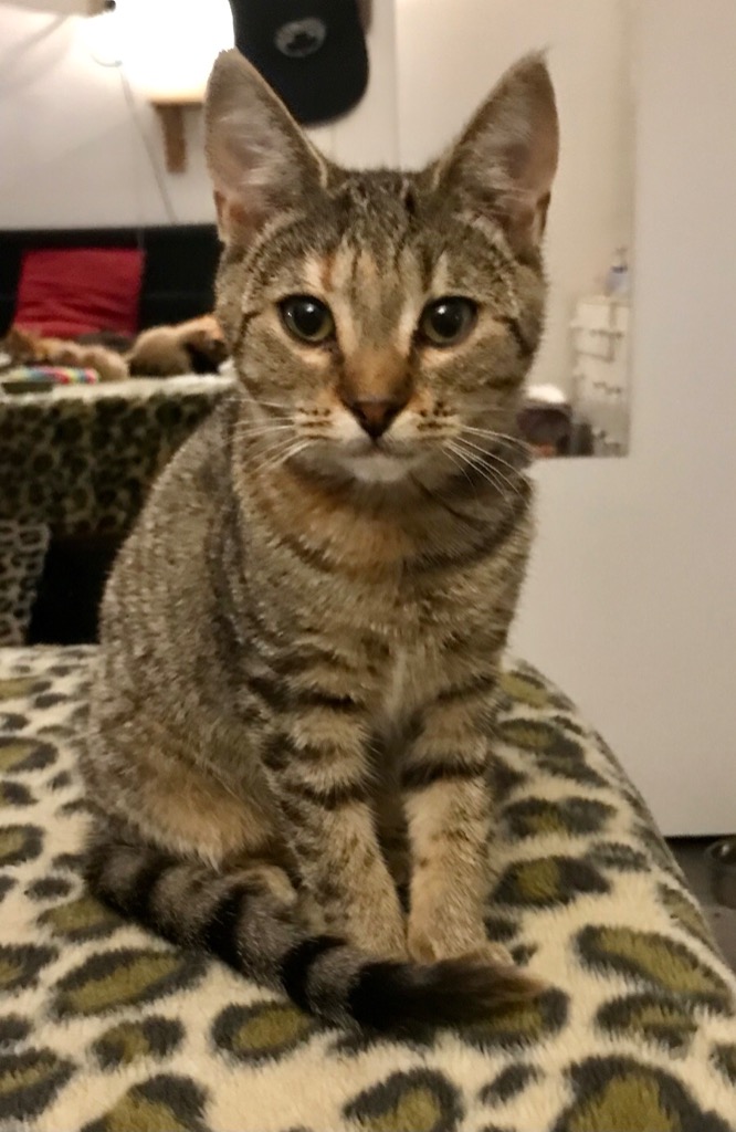 Jessica came into our care with her siblings Bill, Erica, Sookie & Lafayette. Jessica is a sweet little gentle tabby girl. She is very active but also loves her cuddles! She will put her little heart out while snuggling on your lap, & loves to sleep in your bed at night. Her favorite toy is a laser light, and kind of plastic balls with balls. Jessica has grown up with a variety of other foster cats and kittens & 3 rowdy Bengals so she is very well socialised.