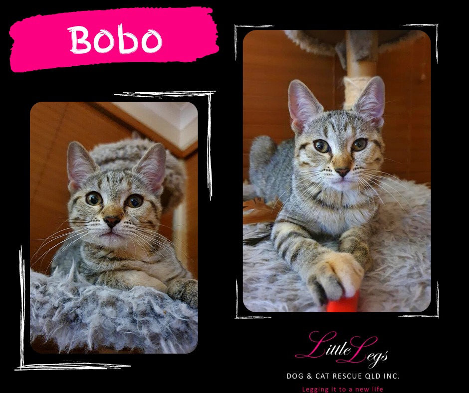 Hi! great that I caught your attention. Well, my name is Bobo and mum Stella says my facial markings always makes her think of a cheetah! Even if I say so myself, I am becoming a big cuddle bum and love being around humans, always get lots of pats and I won't say no to that! That's why I would love you to be home, work from home or if you have 1 friendly feline friend to play with already if you aren't home during the day. My 5 sisters and brothers are now ready to go to their forever homes as well, maybe adopt a pair of us siblings if you don't have a cat already for company? ""hint... hint"" I love playing with my kitten & cat mates who live in the same house, we do hide & seek in the cat tree, see who can run the fastest, try to catch that fast moving red dot on the floor! Ohh I LOVE that game and one of these days I will catch it!! Even a folded piece of paper or playing soccer with a ping-pong ball can amuse me for a long time! When I need my beauty sleep I cuddle up with my fellow cats or stretch out where you are. I know you have been waiting patiently for the time I am big enough to get pre-adopted by you, well, the day is there... Yeah Baby! My foster mom says that for every loving rescued pet is an equally loving human looking for that special match, well look no further, that's meee!! An independent, gentle natured and gorgeous young lady that would love to come home and live with YOU till I'm old & grey ehh silver I mean ... A forever home.. in your heart & home? Oh my heart is beating faster already by that thought! That's the stuff dreams are made of... Well, if you want to get to know me in person? make an appointment for a meet & greet with me, you won't be disappointed, I promise!
